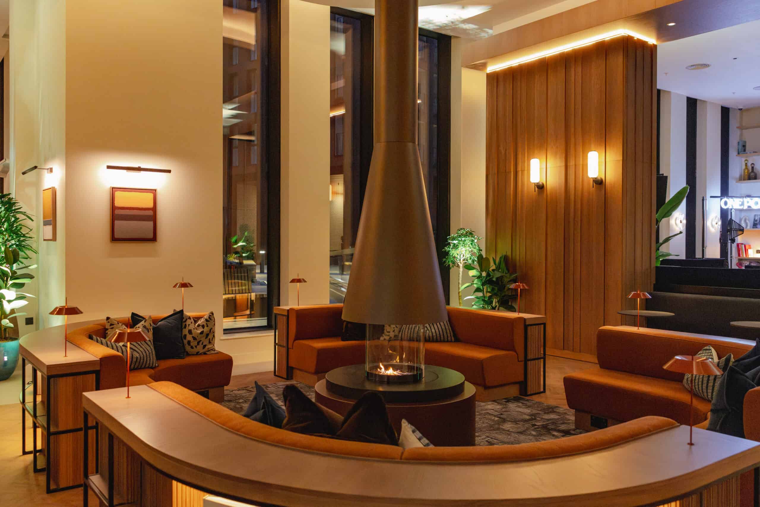 The Grand Lobby: A stunning entrance featuring a 360° firepit and a welcoming atmosphere for residents and guests.